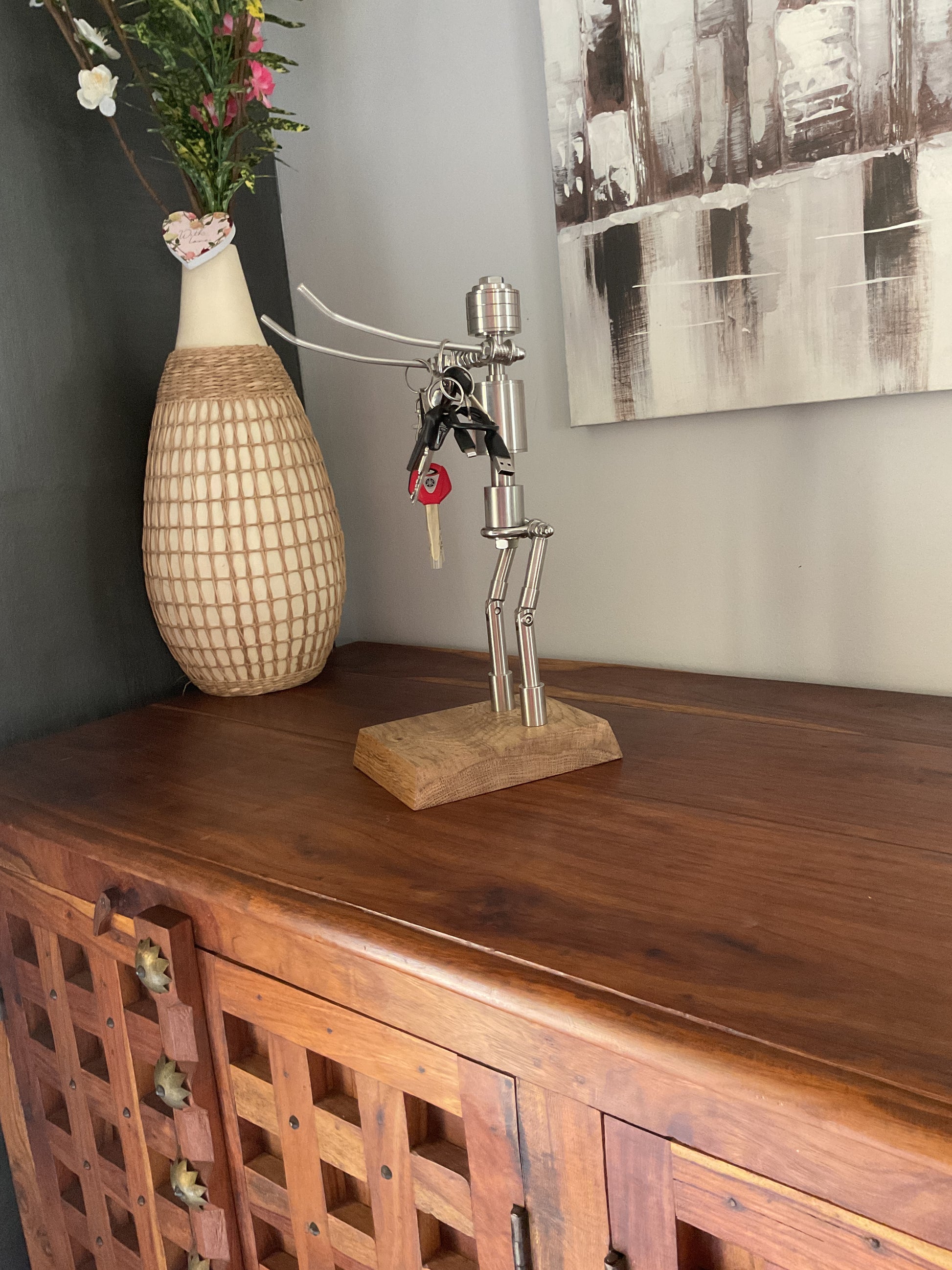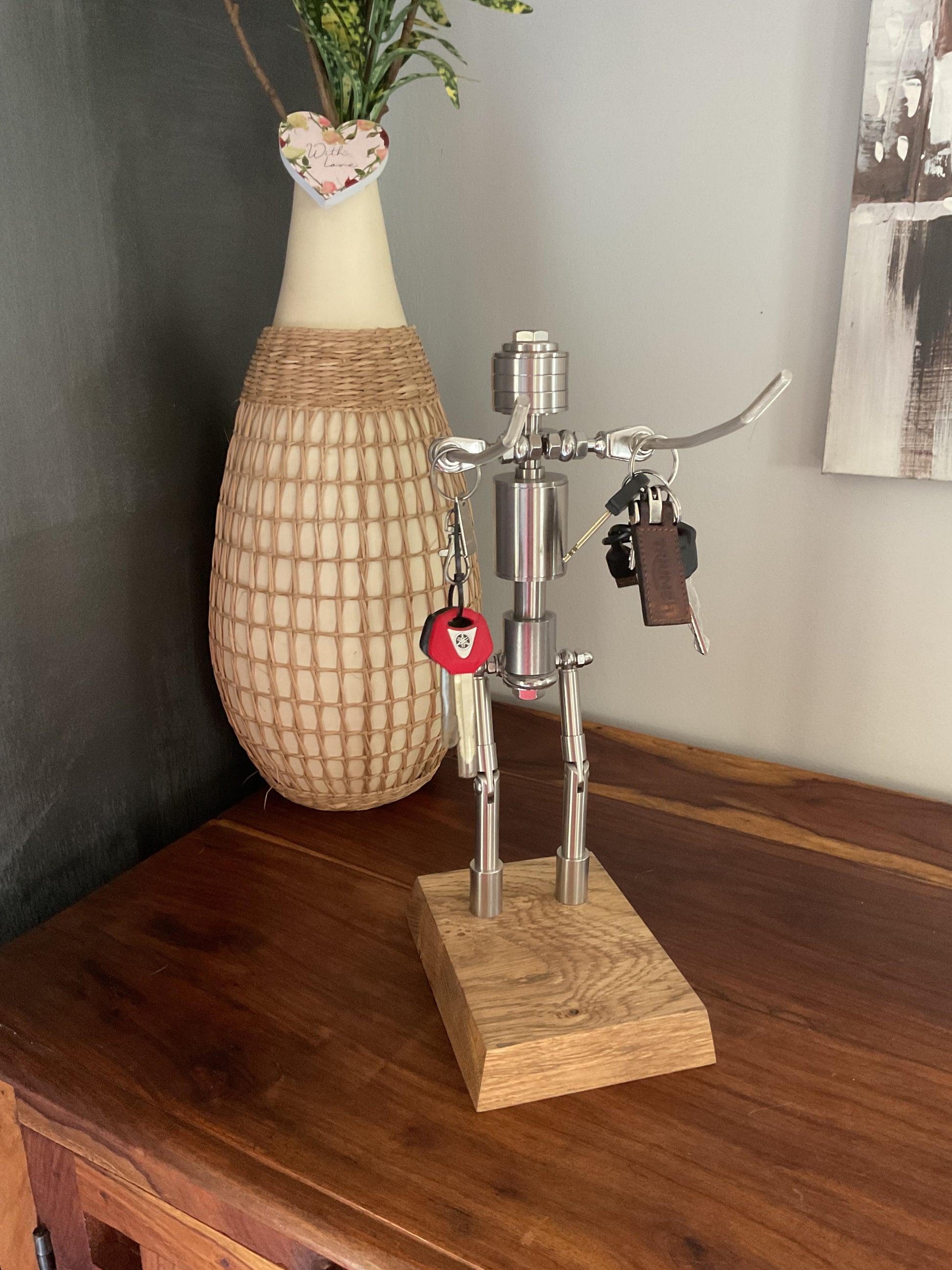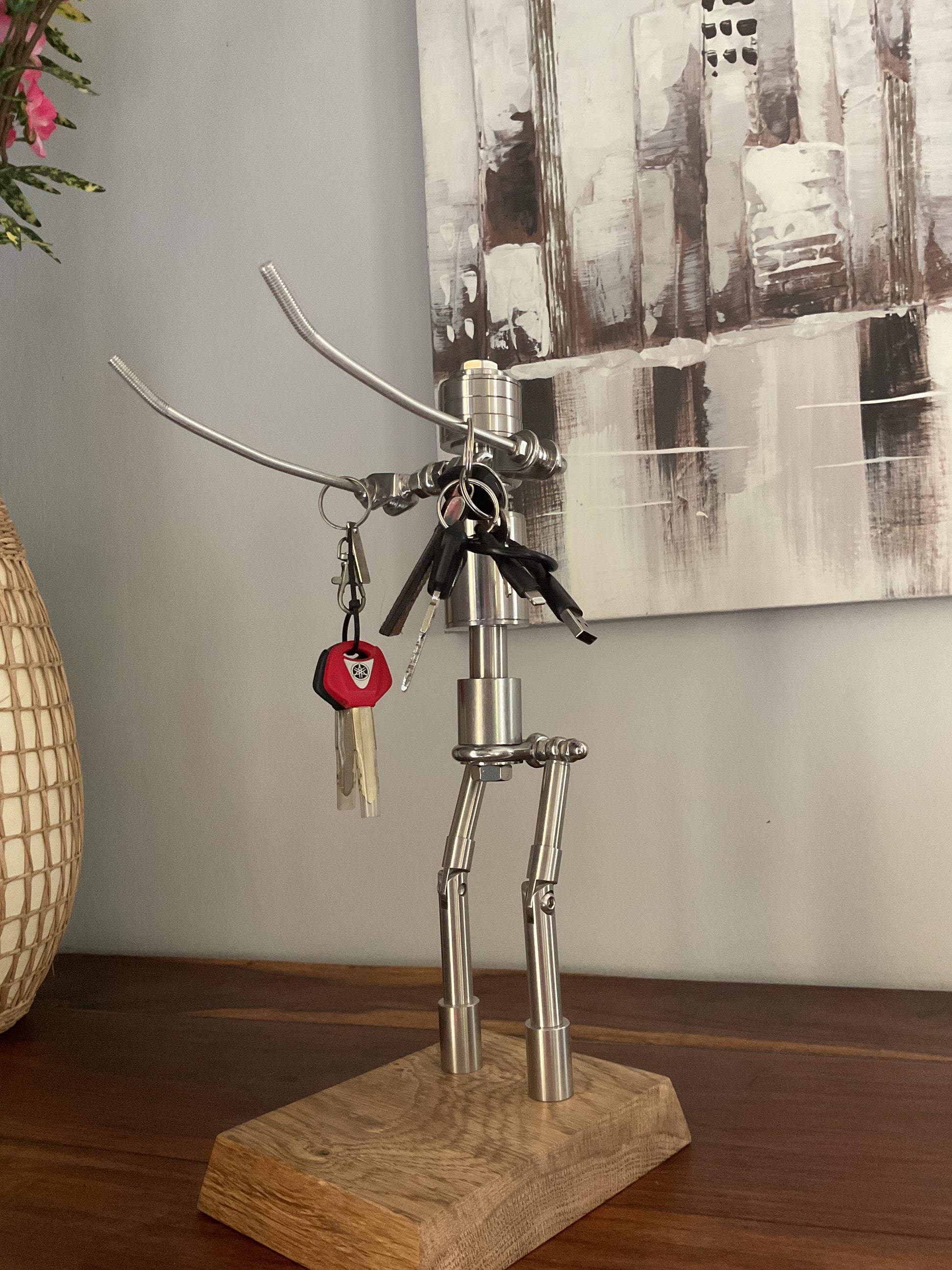 Voici le gardien ultime de votre entrée, il trônera fièrement à côté de votre porte d’entrée sur un meuble ou une étagère, capable de garder toutes vos clés de maison, voiture etc… cet objet unique en acier inoxydable est fabriqué artisanalement dans mon petit atelier de Bessenay vos amis n’en croiront pas leurs yeux